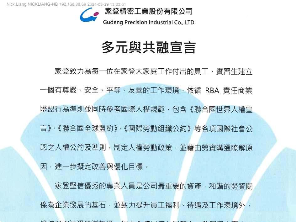 為了逐步邁向更友善的環境,家登從RBA開始實踐,持續檢核公司和整條供應鏈的工作環境安全無虞,每位員工都受到尊重與善待。在獲得RBA白金證書後,亦於每兩年安排第三方機構進到公司驗證,確保我們能不斷地為了員工、環境的福祉持續邁進。