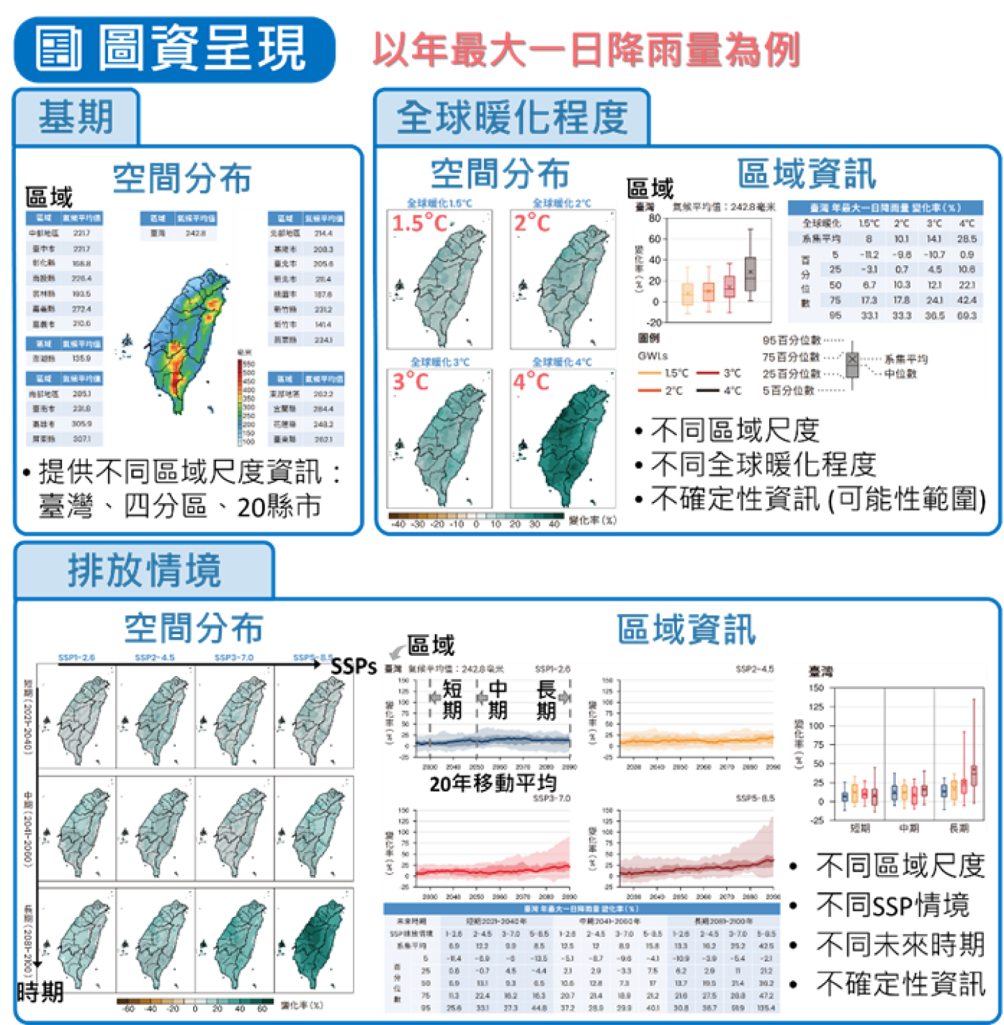 在多模式模擬下,使用圖表來解讀與比較全球不同暖化程度和排放情境的推估數據。