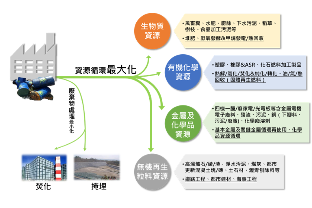 為因應整體廢棄物之清理管制及循環利用,環境部資源循環署(以下簡稱 循環署)於廢棄物管理上,長期致力於推動「資源循環零廢棄」,以減量(Reduction)、再使用(Reuse)、再利用(Recycling)、能源回收(Energy Recovery)、土地新生(Land Reclamation)及改變設計(Redesign)的6R政策。在現有的廢棄物管理基礎上,以源頭減量、資源回收為主,提倡以綠色生產、綠色消費、源頭減量、資源回收、再使用及再生利用等方式,將資源廢棄物有效循環利用,逐步達成全回收、零廢棄之目標,邁向循環經濟及永續發展。