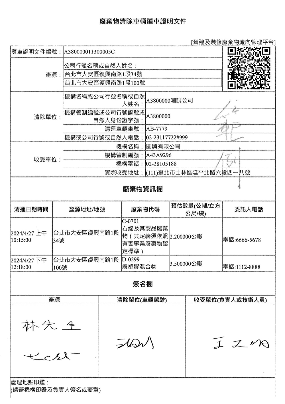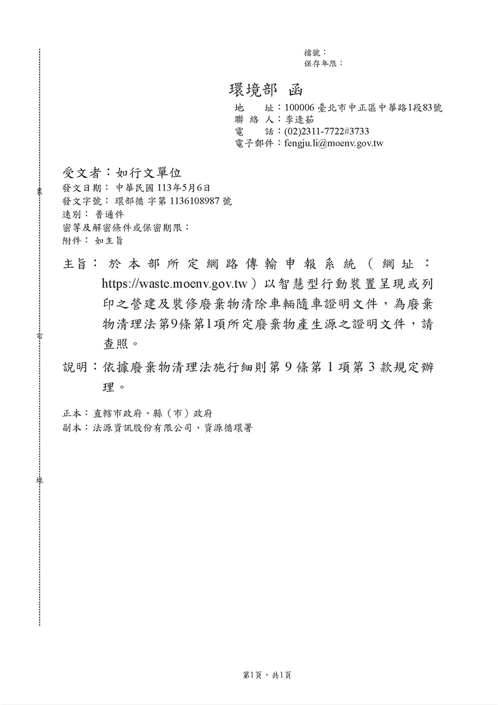 為提升營建及裝潢廢棄物資訊登載便利性及合法性,環境部資源循環署已建置完成「營建及裝潢廢棄物流向管理平台」(https://waste.moenv.gov.tw)並於5月6日上路及函頒,該平台囊括全國營建及裝潢廢棄物相關業者資料。即日起,清運業者使用管理平台填報清運資訊、收受業者於系統平台直接確認,共同保障廢棄物合法清除處理。同時管理平台填寫資料直接產製QR Code,搭配手機可作為隨車證明文件使用,提供在外工作的業者便利使用。